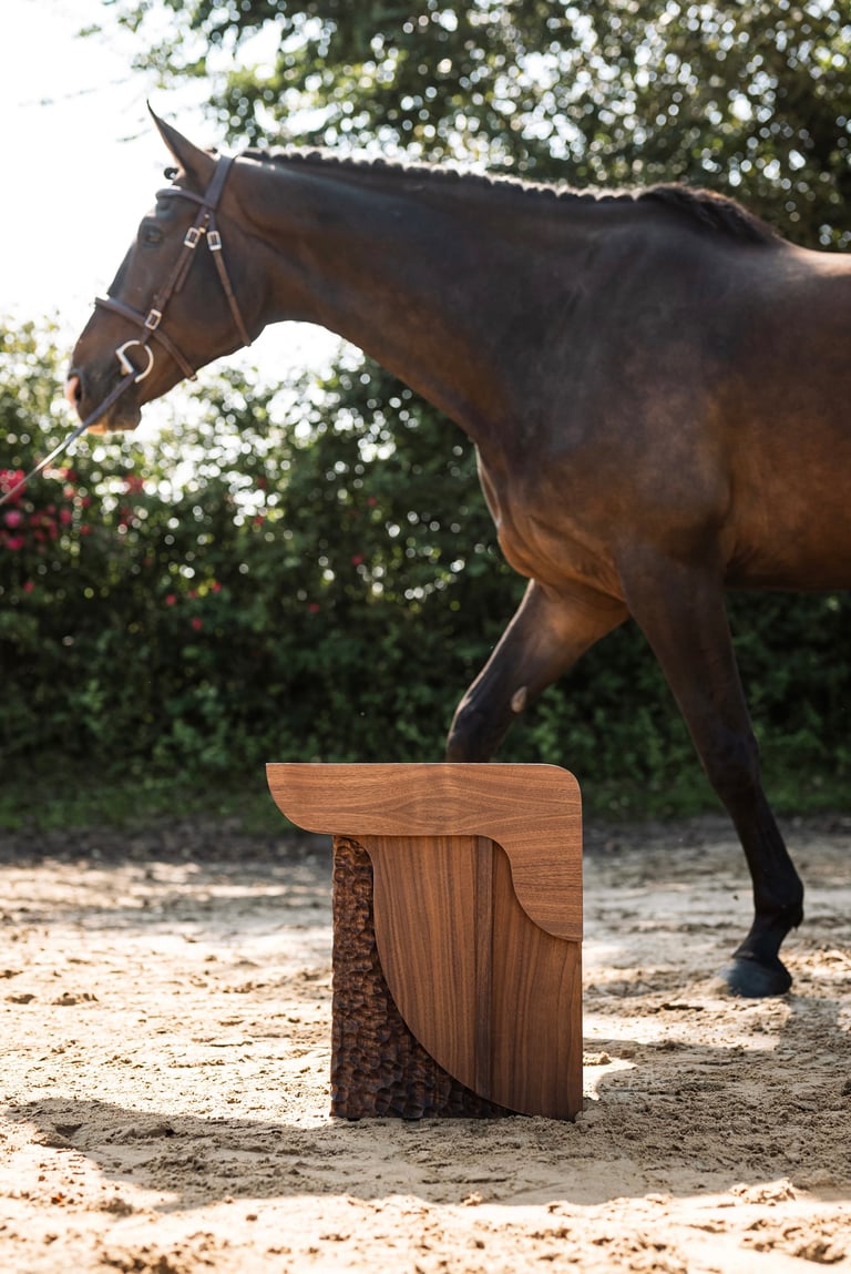 Cette pièce en noyer puise son langage formel dans les lignes sensuelles d’une selle de cheval, capturant le mouvement fluide et la tension contenue du corps en équilibre.